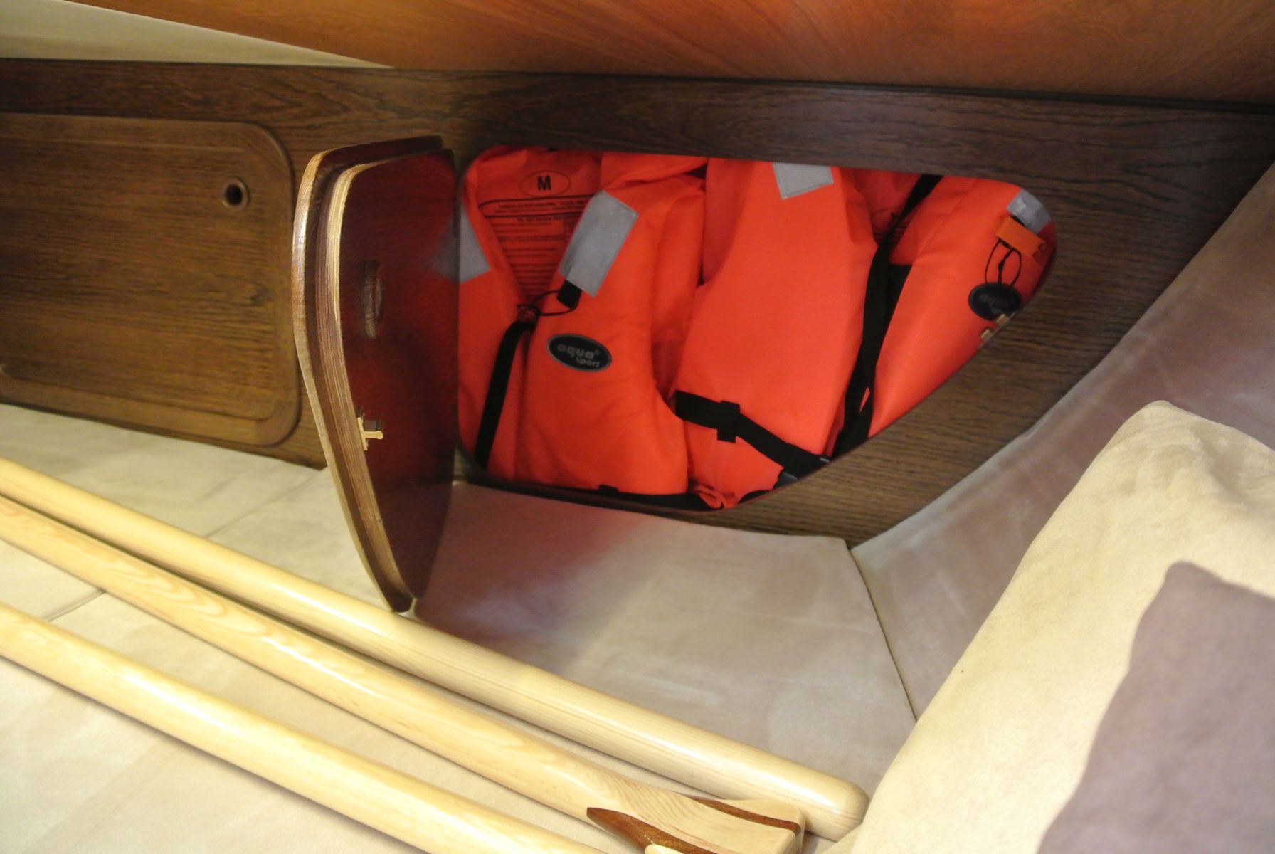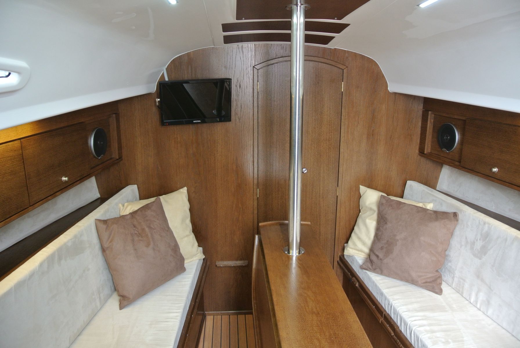 Wyposażenie dodatkowe: bramka do kladzenia masztu, sztywny sztag, roll fok, instalacja wody - zbiornik, radio, CD, TV, lodówka, ogrzewanie, instalacja 230 V, oświetlenie kokpitu